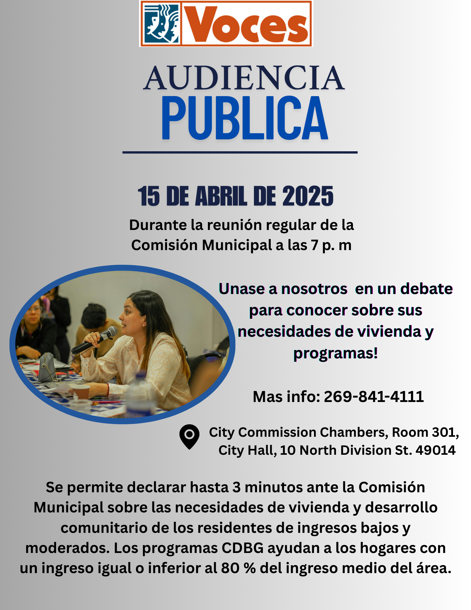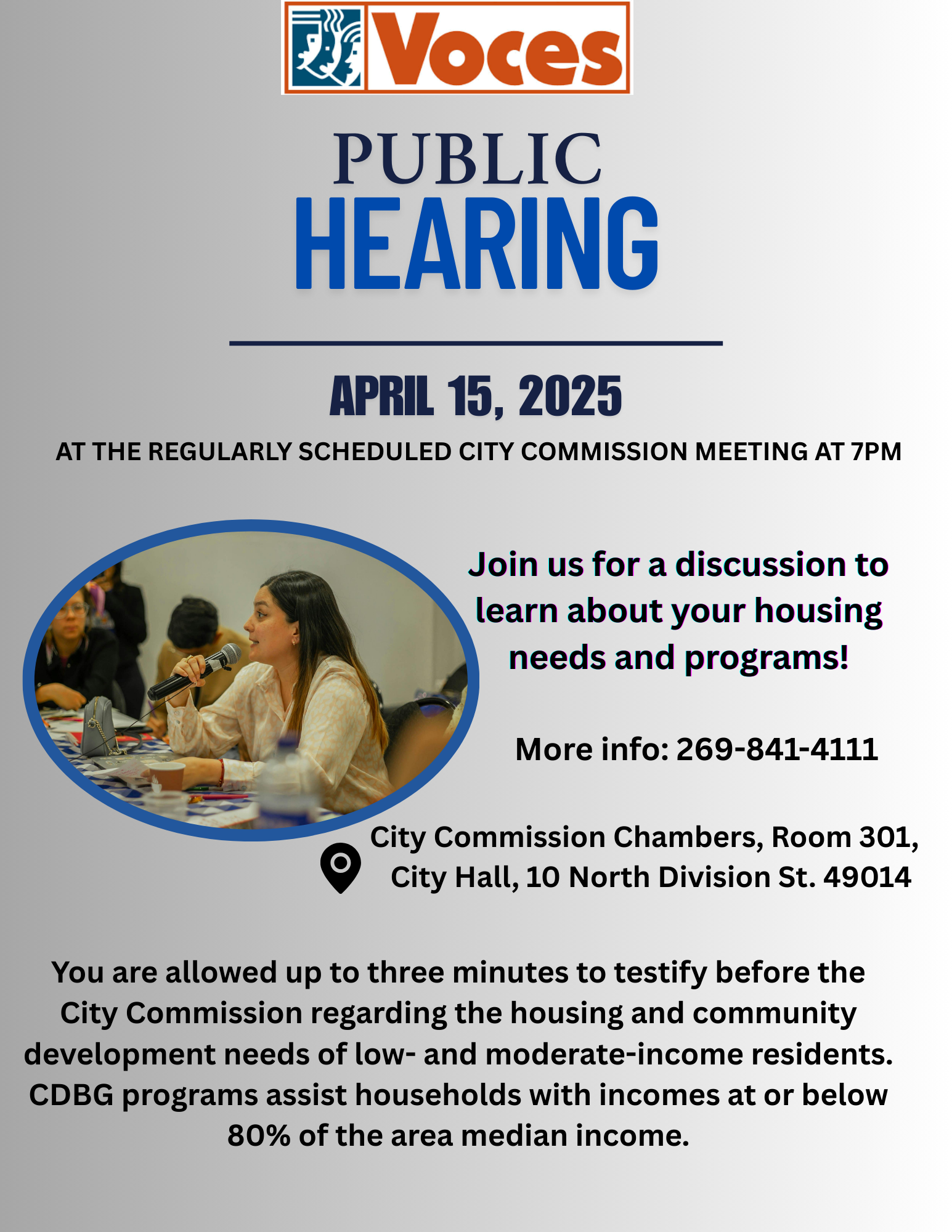 BATTLE CREEK, Mich. - The community is encouraged to participate in an upcoming public hearing on housing and community development needs at the next City Commission regular meeting Tuesday, April 15.