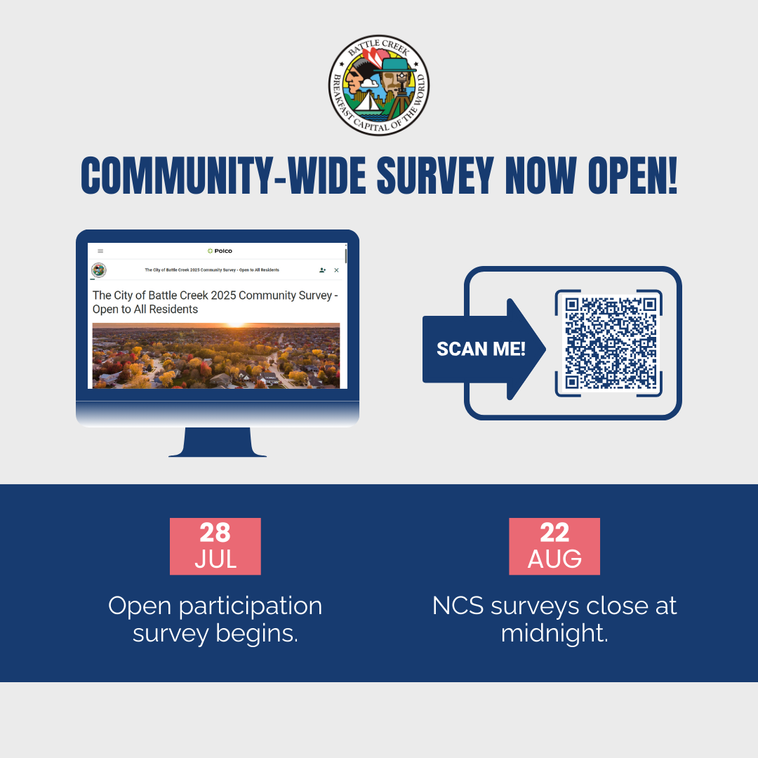 For more information, visit the Community Surveys page. Have questions? Email the City Communications Office at publicinput@battlecreekmi.gov or call the BC311 Information Center at 269-966-3311.